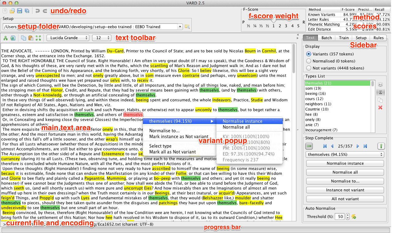 There is also an option to automatically process variants in the current text in the main text area. This is very similar to the batch processing module of VARD, except the output is not produced immediately, instead replacements made can be viewed in the types list and main text area, and further manual processing can take place. Normalisations are automatically made if the top normalisation suggestion has a confidence score equal to or higher than the selected threshold. The threshold can be lowered and automatic processing invoked again, replacing any variants which now have a top replacement with a high enough confidence score. The automatic processor will always use the current confidence scores and f-score weight.