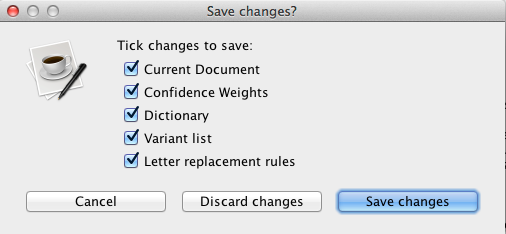 'Save Dictionary' ( ): This option saves any changes to the real words list, i.e. any words removed or added. This is the list checked against when judging whether a word is a variant and also used when searching for potential variant replacements.