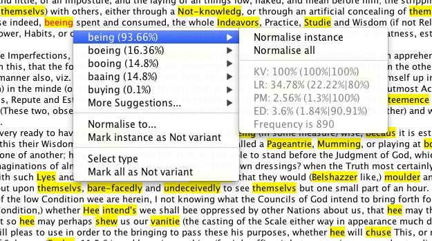 One of the main functions of the user interface is to allow for the manual processing of a single text at a time. The single text interface is similar to that found in modern word processing applications, with a main window displaying the text and spelling variants highlighted in yellow. One can right click on any word to be presented with different options depending on the type of word (variant, non variants or normalised).
